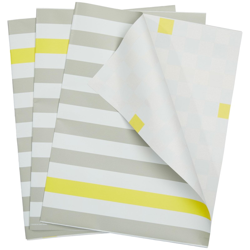 The Gift Wrap Company 58-189212 Stripe and Checkerboard Reversible Flat Gift Wrapping Paper Sheet Set, 30" x 23", Grey, White, and Yellow, 3 Pieces