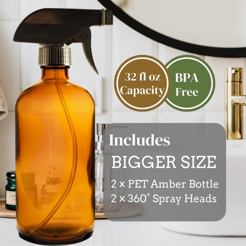 The Green Alcove 360° Heavy Duty Spray Bottle 32oz (2 Pack) | Upside Down Spray Bottles | All Purpose Plastic Amber Spray Bottles