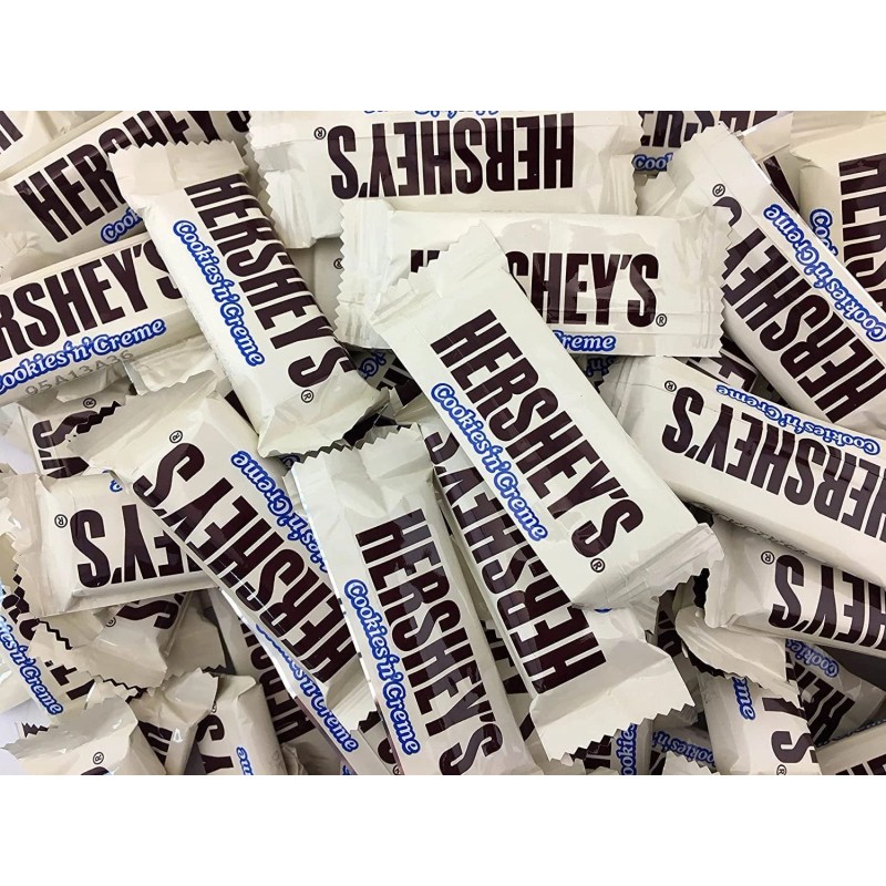 Hershey's Milk Chocolate Snack Size Bars. Individually wrapped snack size candy, Perfect for everyday snacking. A gluten-free and kosher chocolate candy bar. Hershey’s Cookie ‘n’ Crème, These decadent snack size bars combine smooth white crème and crunchy chocolate cookie bits for a classic cookies and crème taste. Hershey’s Milk Chocolate With Almonds, made of the delicious, creamy milk chocolate that's been a classic for decades, HERSHEY'S milk chocolate with almond bars make life more delicious whether they're enjoyed alone or shared with loved ones.