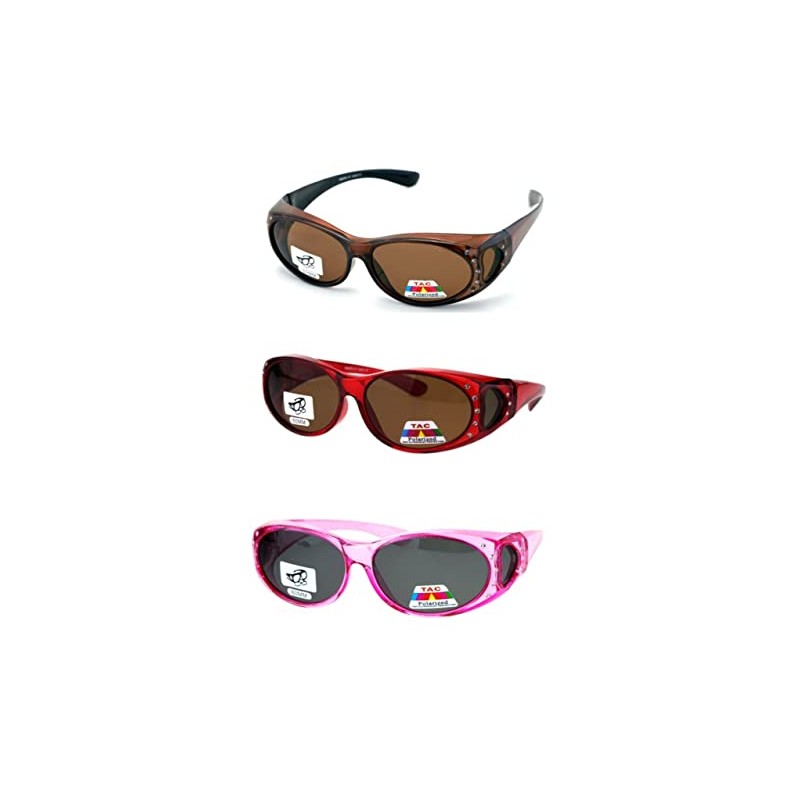 The "High Demand" 3 Pair Fit Over Wrap Sunglasses Polarized Lens Wear Over Eyeglasses (3 Pair Brown/Red/Pink)