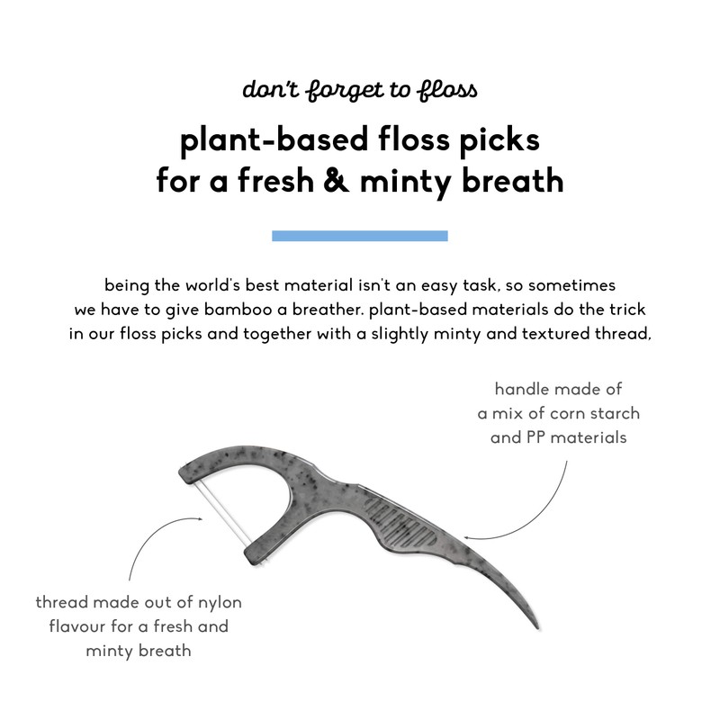 - FLOSS PICKS MADE ENTIRELY FROM PLASTIC? THAT'S WHAT WE CALL OLD SCHOOL. Our picks are made primarily from corn-starch and packaged in eco-friendly paper packaging, Humble floss picks aim to minimise the stress on our environment whilst providing a first class experience. 50pcs of floss picks per pack.