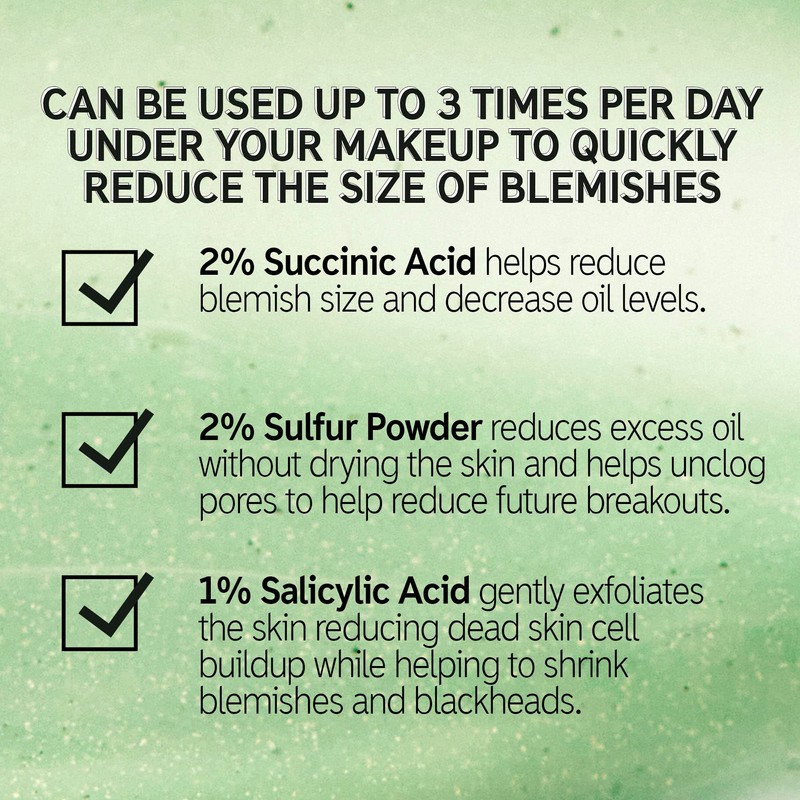 - Powerful Ingredients, Real Results. Succinic Acid gently reduces blemish size and oil levels. 2% Sulfur and 1% Salicylic Acid unblocks pores and shrink breakouts and blackheads while remaining gentle on the skin.
