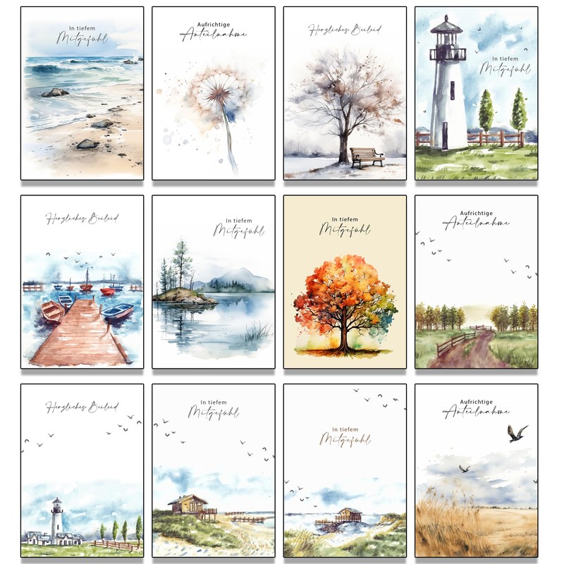 - 12 different simple yet stylish designs in watercolor style. 2 of each design, total 24 cards.