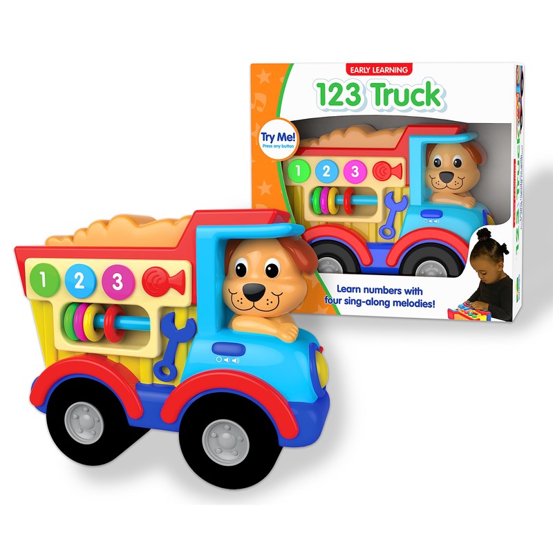 - key features - this playful interactive numbers dump truck features four classic melodies for hands-on learning fun! the 123 truck is safe and a great learning tool for both boys and girls ages 18+ months. the specs: four sing-along retro melodies, on/off/volume button, auto-off feature, free-standing colorful design, cute kid-friendly dog character with added clacking rings, and four electronic pre-programmed buttons. requires two aa batteries (included).
