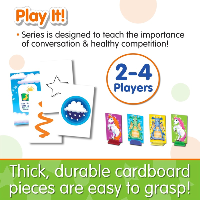 - KEY FEATURES – Ready, set, go! Race to the Rainbow is a challenging and whimsical game that helps teach color and shape recognition! Simply choose your unicorn or dragon character and take turns drawing game cards. Dash your creature along the colorful path to the color or shape that is shown on your card. If you are lucky enough to land on a rainbow, slide across it to get ahead. But be careful! If you choose a rain shower card, you must go backwards to the last rain cloud space! The first player to reach the rainbow castle wins! Includes four character cards, 42 game cards, and game board.