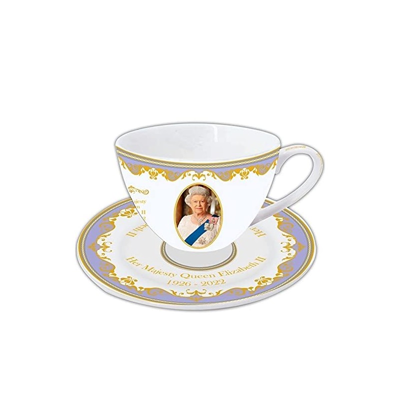 - Enjoy a cup of tea or coffee in refined, classic style, with one of these high-quality Cup and Saucer. This elegant Cup features two images of Queen Elizabeth II.