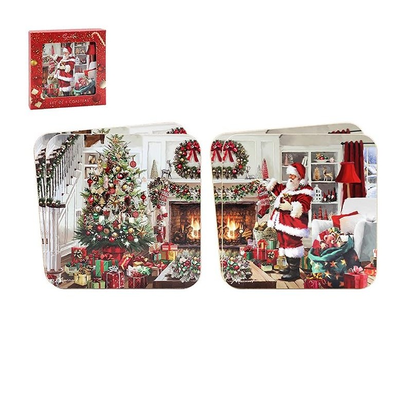 - SANTA DESIGN: These artistic coasters feature a jolly design of Father Christmas in a cosy festive lounge placing gifts under the tree, taken from an original artwork from Richard Macneil.