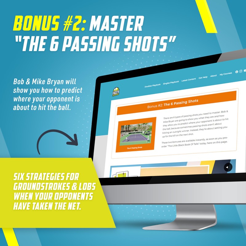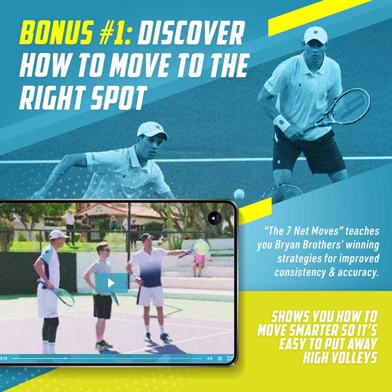- BONUSES - The professional tennis insights don’t stop with the book, because we’ve got two awesome bonuses from Bob & Mike Bryan: 1) “The 7 Net Moves,” and 2) “The 6 Passing Shots.” It’s essential you master how to move at the net, and how to pass your opponents when they take the net, if you want to have more success in doubles.