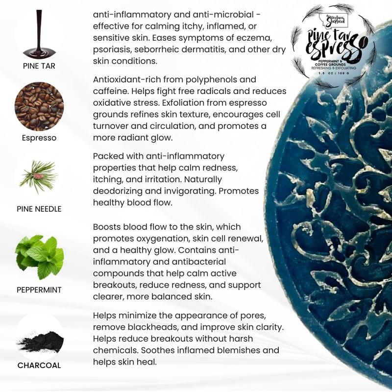 - Deep-Cleansing & Exfoliating C Pine tar detoxifies while ground espresso gently buffs away dead skin.