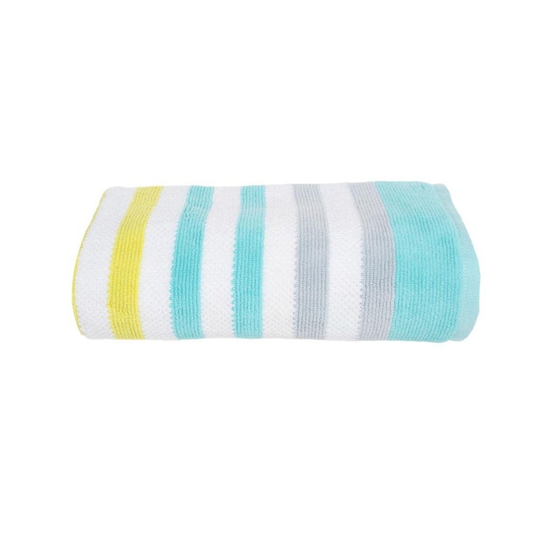 - Incluye 1 Toalla de Medio Baño en 620gr. Color Blanco con rayas Azules y Verdes.
