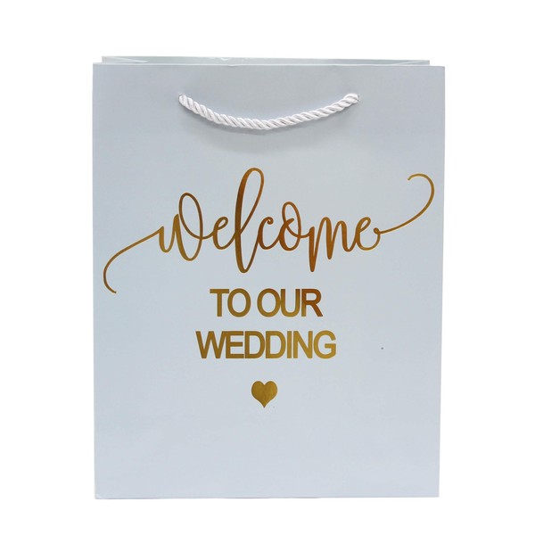 - Each bag embossed with ‘'Welcome to our Wedding’’ in Gold Foil Letters. Each gift bag made with durable thick paper for great support of heavier gifts. Each bag has quality rope handles making it easy to tote your gifts. Each bag embossed with ‘'Welcome to our Wedding’’ in Gold Foil Letters. Each gift bag made with durable thick paper for great support of heavier gifts. Each bag has quality rope handles making it easy to tote your gifts.