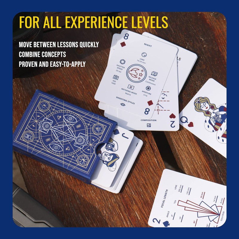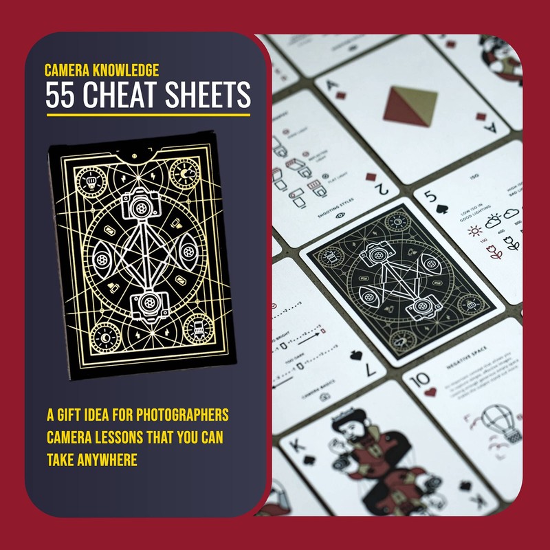 - CHEAT SHEET - Both the standard and waterproof editions cover the most important rules and techniques about photography. Each of the court cards has uniquely designed camera artwork, doubling up as photography tip cards and playing cards.