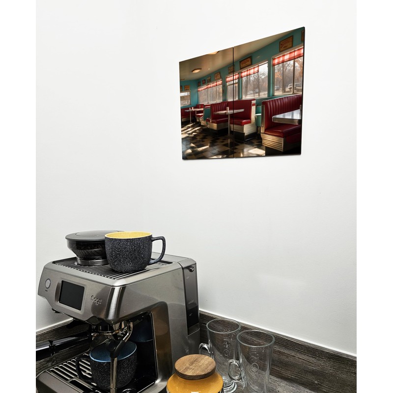 • 🌞 Bask in the nostalgic warmth of sunlit red booths and gleaming checkered floors, printed directly onto sturdy 6mm MDF wood.