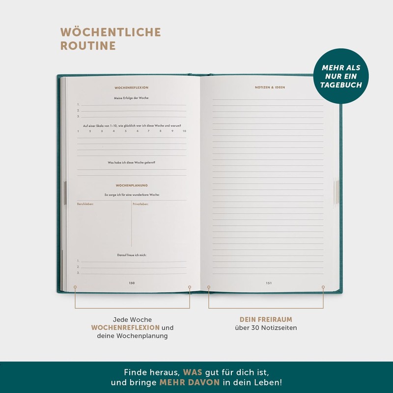 - Targeted self-reflection for more focus on progress and the good in you and around you – this journal allows you to communicate with yourself. You find out what makes you really happy. Then you build positive habits – like gratitude, optimism and daily self-love – that add more to your life. Constant and proactively in the right direction!