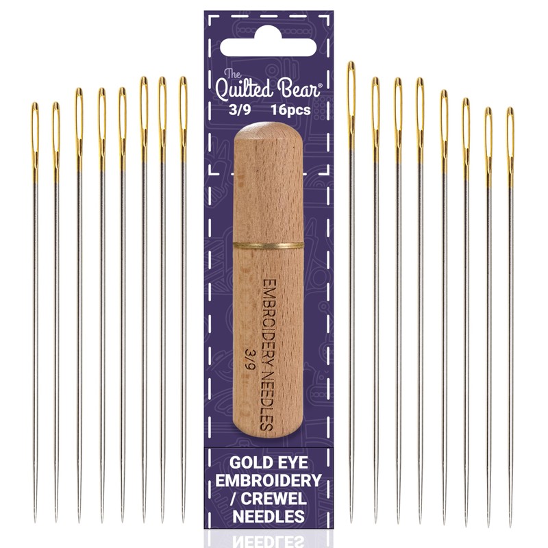 The Quilted Bear Gold Eye Crewel Embroidery Needles 3/9-16 Large Eye Sharp Point Crewel Needles for Embroidery in a Premium Engraved Wooden Case for Embroidery & Hand Sewing (Sizes 3/9)