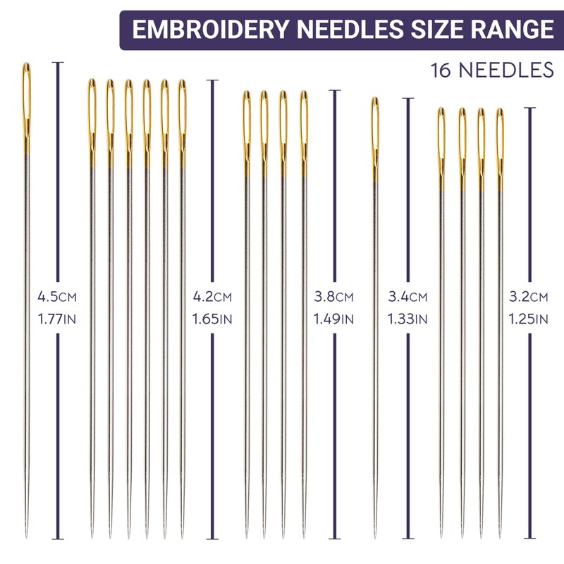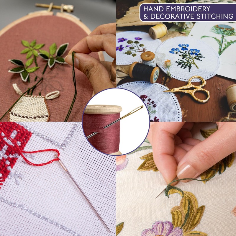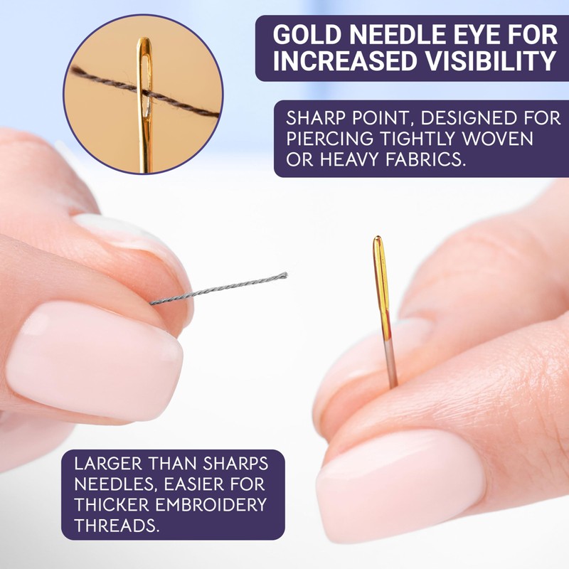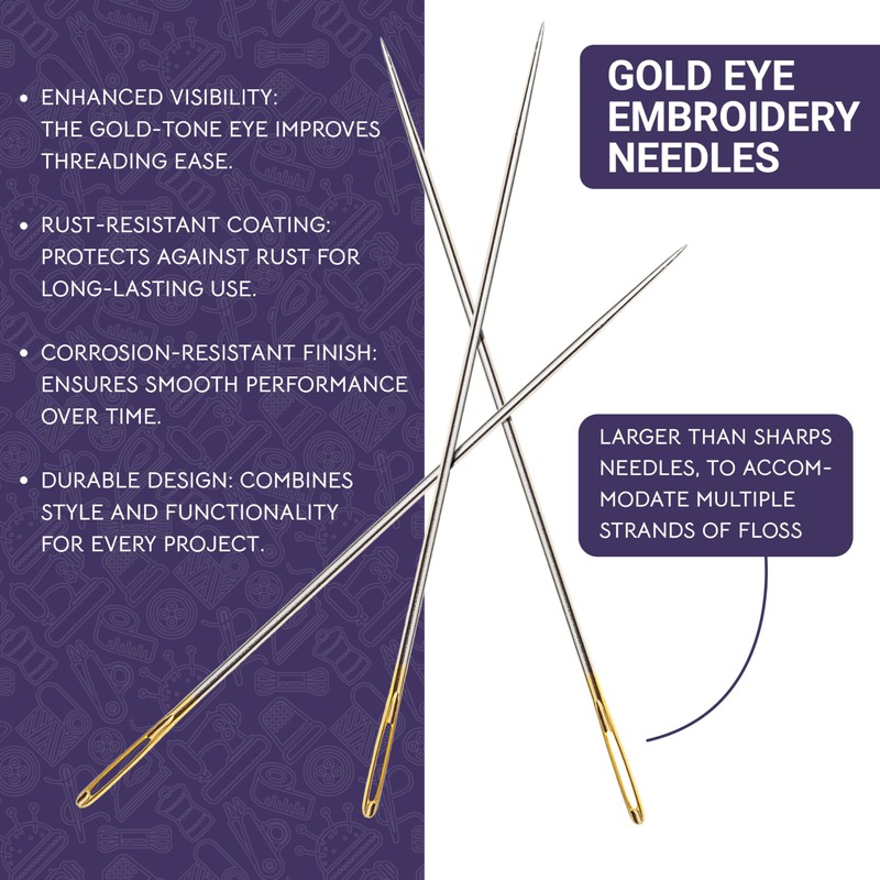 • Premium Gold Eye Crewel Needles: Our gold eye crewel embroidery needles for sewing are crafted for precision and durability. Ideal for intricate designs, they combine the finesse of a darning needle with the ease of use of sewing needles large eye.