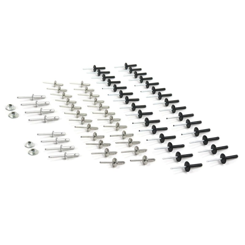 - Includes - (30) Aluminum Rivets, (24) 3/16 x .70 Rivets, (8) 1/4 x 1/2 Rivets & (4) Nuts; comes as shown in the first image