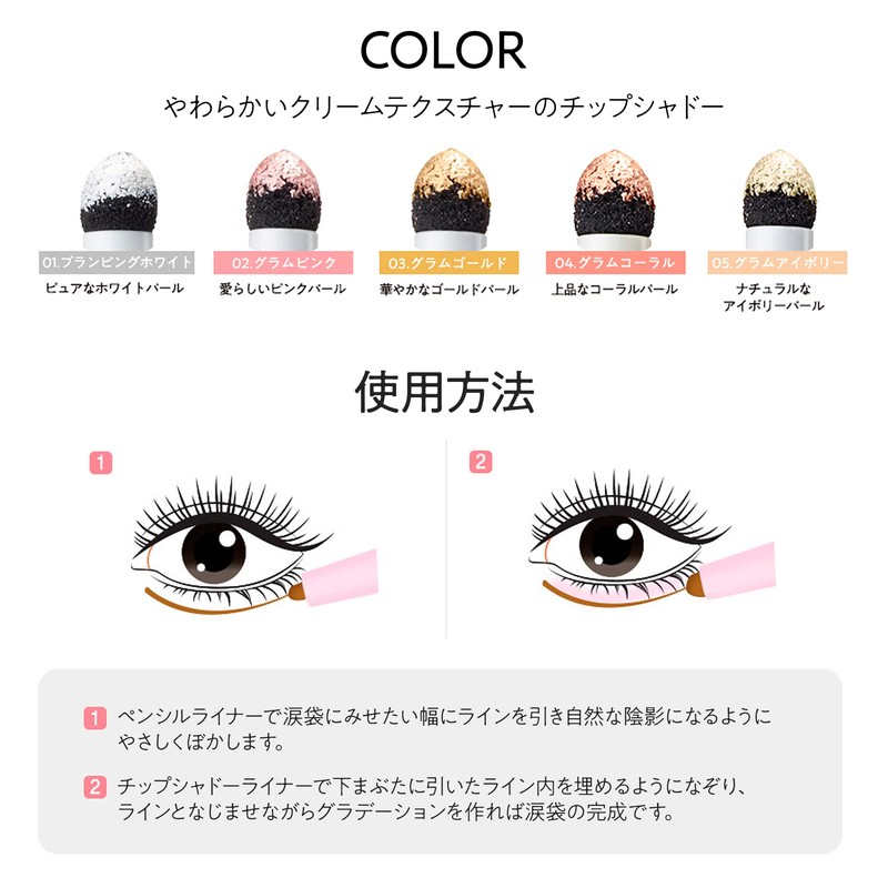 - This 2-in-1 under-eyeshadow liner includes 2 functions: a chip shadow liner that draws a plump tear-sachet and a pencil liner that draws the shadows of tearsacks