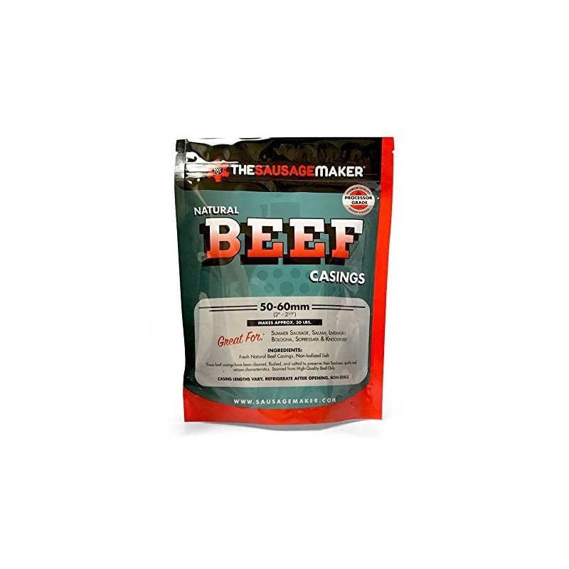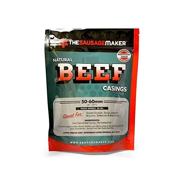 Smaller Pack of Beef Middles now available in 50-60mm size (2" - 2 3/8") stuffed diameter. Ideal for small batches of Summer Sausage, Sopressata, Salami, Bologna, Knockwurst or other larger than average sausage. Casing lengths will vary. Casings are not easily digestible and not recommended for eating, but should be peeled after product is made ready to eat. Packed cleaned, flushed and salted to preserve freshness. Makes about 30 lbs. of Sausage. Do NOT Freeze Natural Casings. Keep refrigerated. Casings will give off odor if warmed, this does not mean it is spoiled, returned to refrigeration will reduce/remove smell. Easy Summer Sausage Recipe on Label. Packaged Item Dimensions: 7" L, 1" W, 9" H Makes about 30 lbs. of Sausage. Composed of 3-6 middles of varying lengths. Includes 1 Pack Per Order.