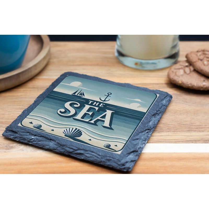 'The Sea' Slate Coaster | Nautical Design | Coastal Home Décor (slco-ds24-seanchorrg)
