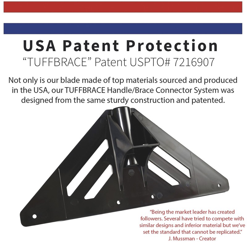 - PATENTED - We've developed and patented the handle/brace connector system, The TUFFBRACE is optimized for sturdiness and toughness. Use on concrete, blacktop, pavers, decks, roofs, ice rinks and more with no need to sharpen with the self sharpening blade with every use.