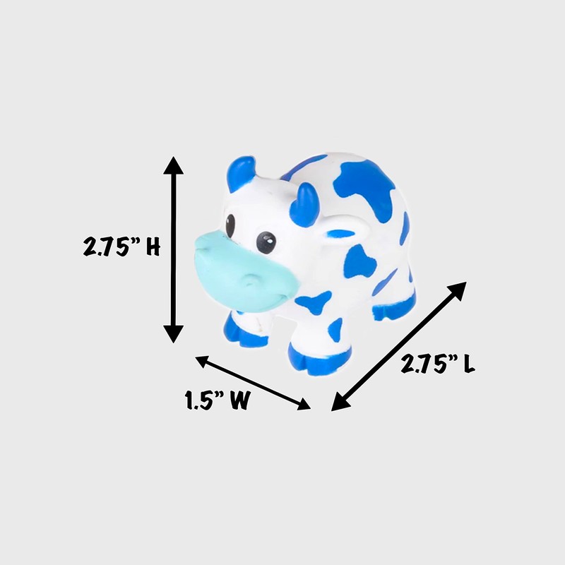 One dozen rubber cow bath toys.Each order has 12 units of assorted colors. Each cow measures around 2.75" long.