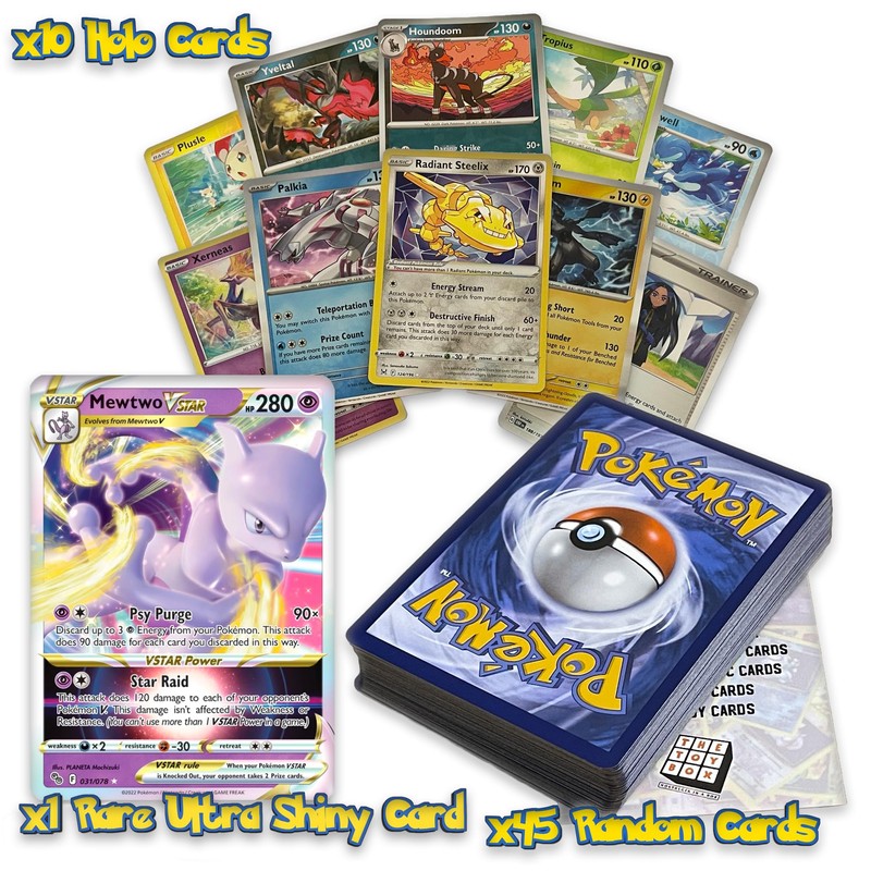 The Toy Box Ultimate Shiny Card Bundle - 50 Random Cards Guaranteed 10 Holos + 1 Rare Ultra Shiny Card Plus The Toy Box? Card Compatible with Pokemon TCG
