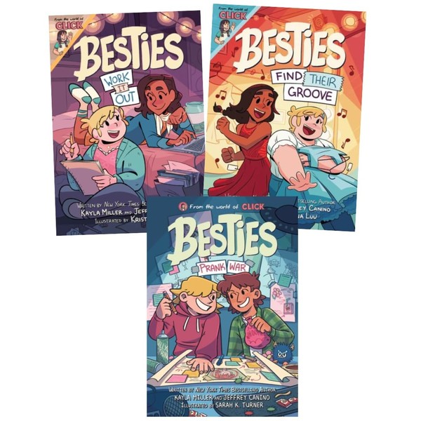 This The World of Click Series 3-Book Collection Set by Kayla Miller and Jeffrey Canino follows the adventures of best friends as they navigate through various challenges, from solving problems to learning important life lessons. This set includes three engaging books: Besties: Work It Out where the friends figure out how to overcome challenges together, Besties: Find Their Groove which explores their growth and teamwork, and Besties: Prank War which brings them into a lighthearted competition. These books are perfect for young readers who love stories about friendship, teamwork, and fun.