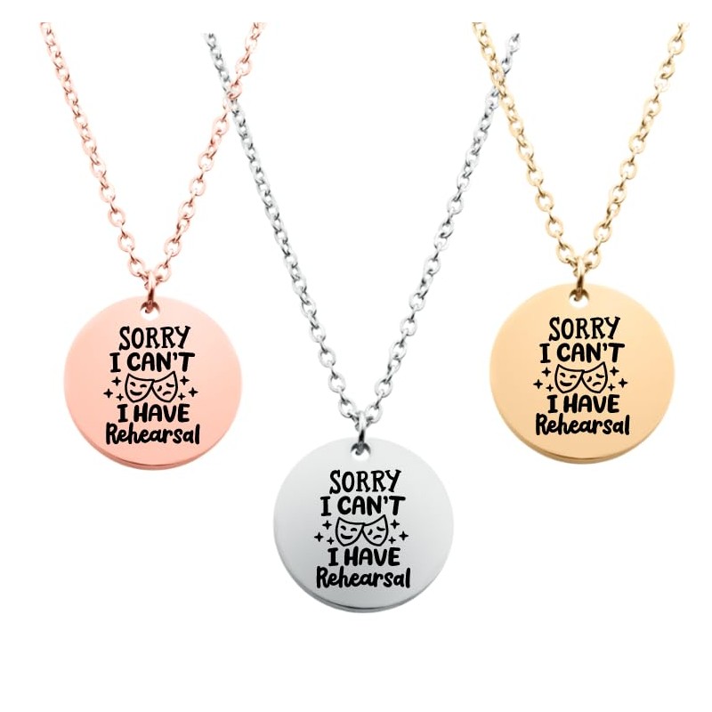 Introducing our Drama Theater Engraved Necklace, a captivating accessory that brings the excitement of the stage to your everyday look. Featuring the phrase "Sorry I Can't I Have Rehearsal " delicately engraved on a pendant, this necklace is a stylish way to showcase your love for theater. Crafted with both elegance and durability in mind, it's a meaningful gift for actors, theater aficionados, or anyone who appreciates the art of projection. Wear this necklace to carry the spirit of performance with you and spark engaging conversations about the dramatic world.