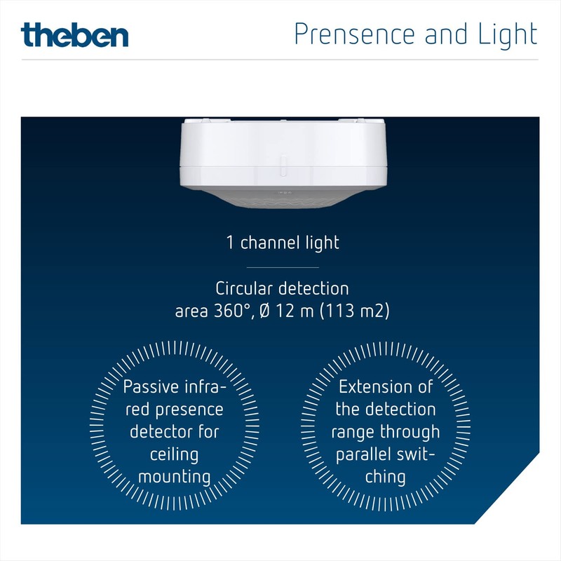 - Passive infrared presence detector for ceiling mounting AP with round detection range 360°, diameter 12 m (113 m2) at 3 m mounting height and 1 channel light (relay 230 V)