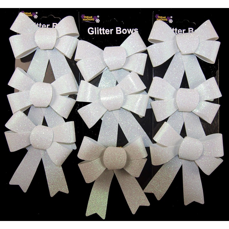 Theme Machine Set Of 9 Glitter WHITE Bow Christmas Tree Baubles Decorations