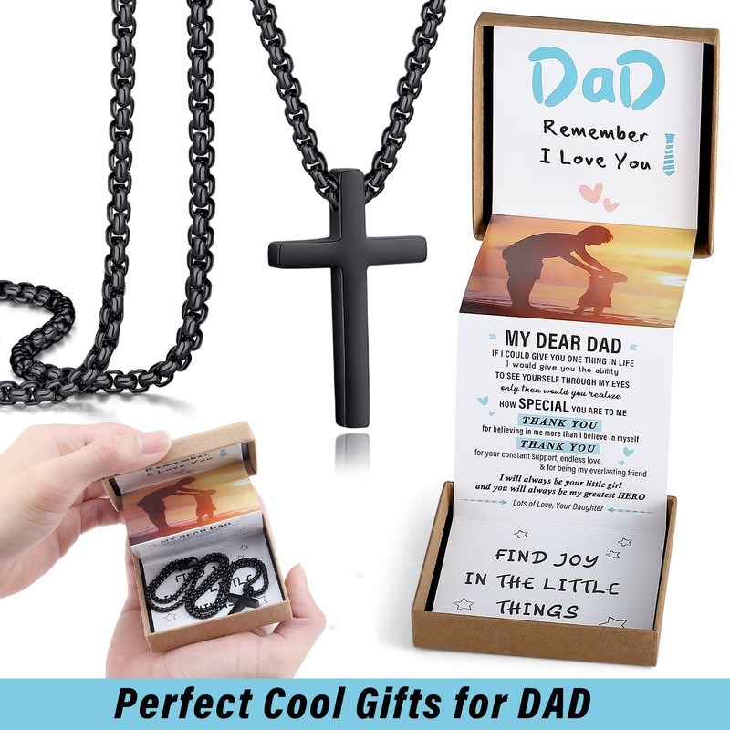 - 【Unique and Especially for Dad】A cool cross necklace is an excellent option if you are looking for something classic and versatile for your dad. The special pull out gift box is super cute, sweet image and the sentimental text that especially for your dad is a great touch. It makes a lovely gift as gifts for dad, Fathers Day gifts from daughter, cool birthday gifts for dad who wants nothing, best dad ever gifts for dad who have everything.