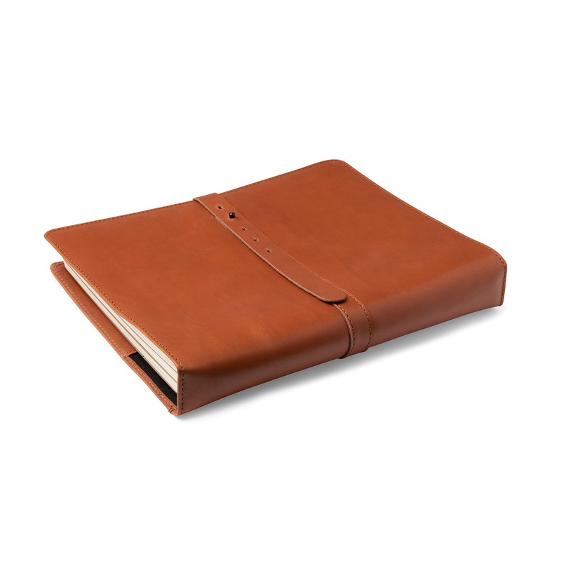 - UNIQUE DESIGN: Designed to fit a Moleskine Notebook XXL and a letter size Blank Cookbook, Notebook or Sketchbook, this unique leather binder comes in a classy Cognac Brown color, has 4 attached elastic straps to hold up to 4 notebooks, large side pockets to the right and left side to keep your notes, card with cooking measurements and recipe cards, and a leather belt strap to hold your family’s keepsake memory book or family cookbook tightly in place.