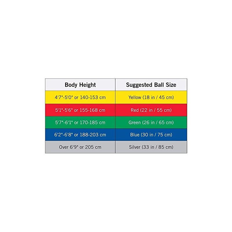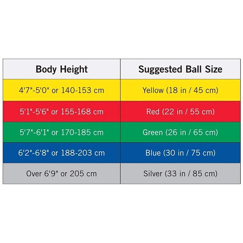 * **45 cm/17.7" ball** is appropriate for people of heights between 55"-60" or 140-150 cm. _Yellow ball._ * **55 cm/21.6" ball** is appropriate for people of heights between 61"-66" or 155-165 cm. _Red ball._ * **65 cm/25.6" ball** is appropriate for people of heights between 67"-71" or 170-180 cm. _Green ball._ * **75 cm/29.5" ball** is appropriate for people of heights between 72"-75" or 183-190 cm. _Blue ball._ * **85 cm/33.5" ball** is appropriate for people of heights over 75" or 190 cm. _White ball._