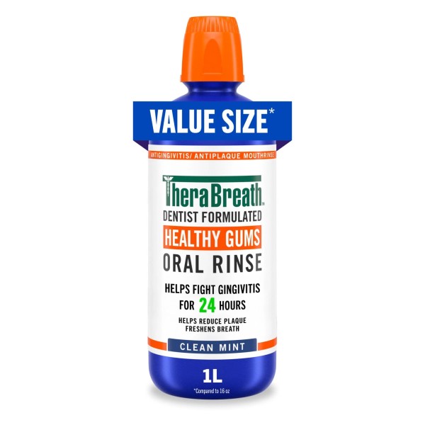 - 1 Liter bottle of TheraBreath Healthy Gums Oral Rinse in a Clean Mint flavor; this antigingivitis, antiplaque mouthwash is dentist formulated and alcohol free