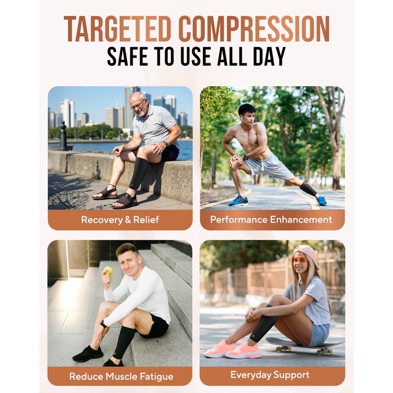 - SECURE FIT WITH BREATHABLE COMFORT: Our lightweight, moisture-wicking copper compression sleeves for calves keep your legs dry and comfortable all day long. Copper calve sleeves have a non-slip design, the copper leg sleeve won’t roll or slide during runs, workouts, or long shifts. Their slim, footless design fits easily under pants or uniforms. This copper leg brace is suitable for both athletic use and daily support, making it a reliable wellness tool in your active lifestyle.