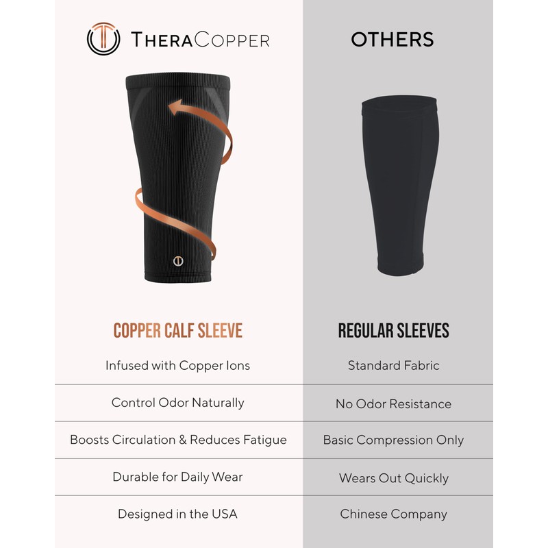 - YOU DESERVE THE BEST: At TheraCopper, we’re an American brand specializing in real copper wellness products built for results you can feel. Our copper compression calf sleeve is engineered for maximum performance, support, and comfort. Not completely satisfied with our shin compression sleeve for shin splints? We’ll make it right—no questions asked.