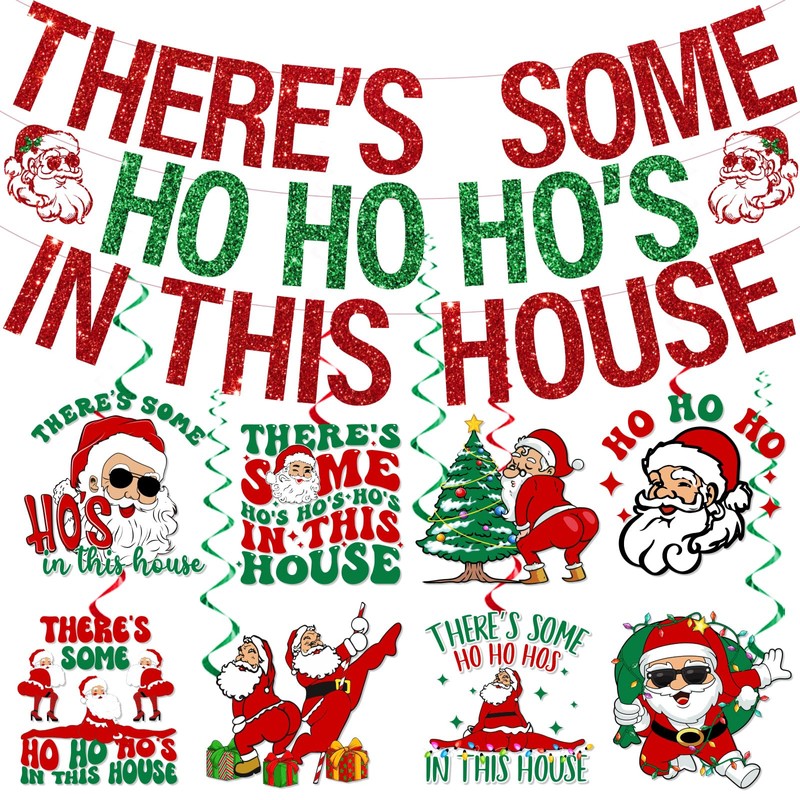 - value package: our funny christmas decorations comes with 1 pc theres some ho ho hos in this house banner , 8pc ho ho ho christmas decorations hanging swirls and come with 8 pcs of different card cutouts in 8 different designs; 8 pcs whirls glitter foil ceiling swirls streams in colorful, and clear plastic hooks for hanging. our ho ho hos in this house will be a big hit at your christmas party and adding festival atmosphere by setting this funny christmas decorations