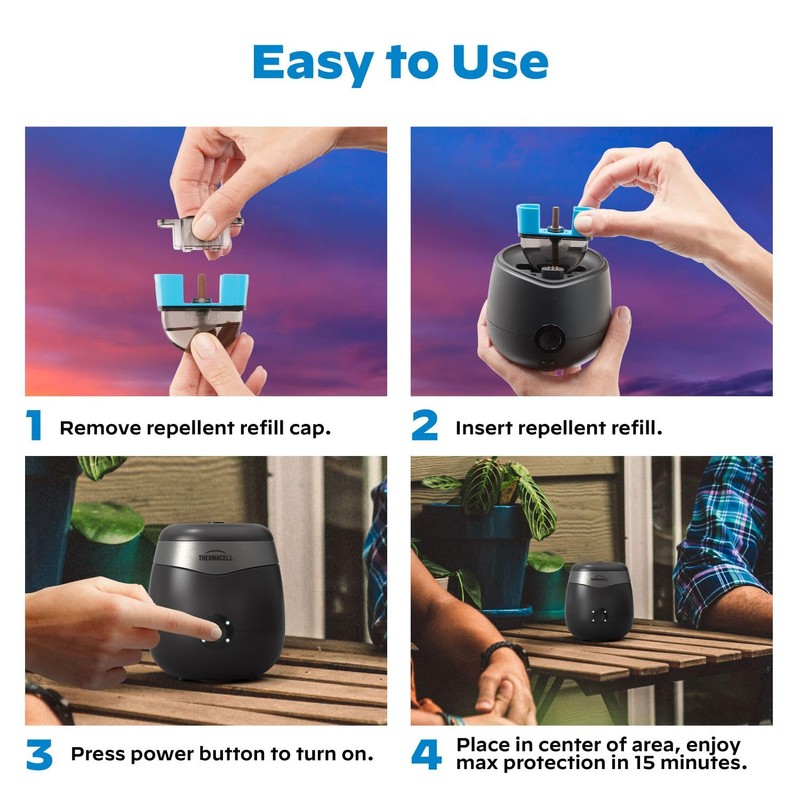 - THERMACELL GUARANTEE: Extend warranty to 3 years with registration (automatic 2-year warranty included). Backed by Thermacell Guarantee. See packaging for details. Includes repeller, one 12-hour scent-free refill, and USB charging cable.