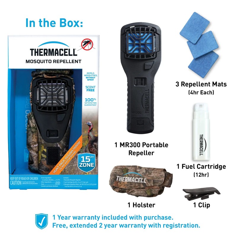 The hunt pack includes the MR300 in black, a camo cover for the MR300, a bottle of butane and repellent mats that last up to 4 hours each.
