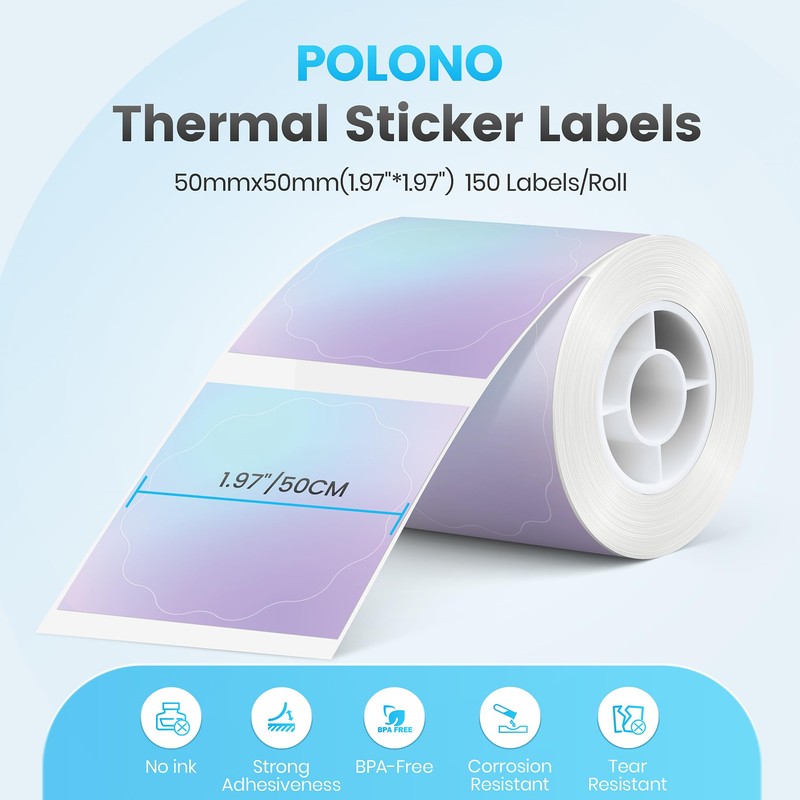 - 【Specifications】Label Size: 1.97"x1.97" (50x50mm). Quantity: 1 Roll, 150 labels. Color: Gradient Purple. Genuine themal label tape compatible with POLONO PM220S label maker, it may not work on other label printer