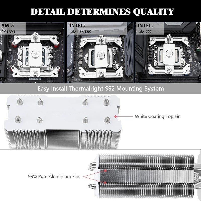 - Compatibilidad: el zócalo de enfriador de CPU admite Intel: 1150/1151/1155/1156/1200/1700/17XX, AMD: AM4/AM5; para diferentes plataformas de zócalo de CPU, se proporcionan placas de montaje correspondientes o piezas de sujeción