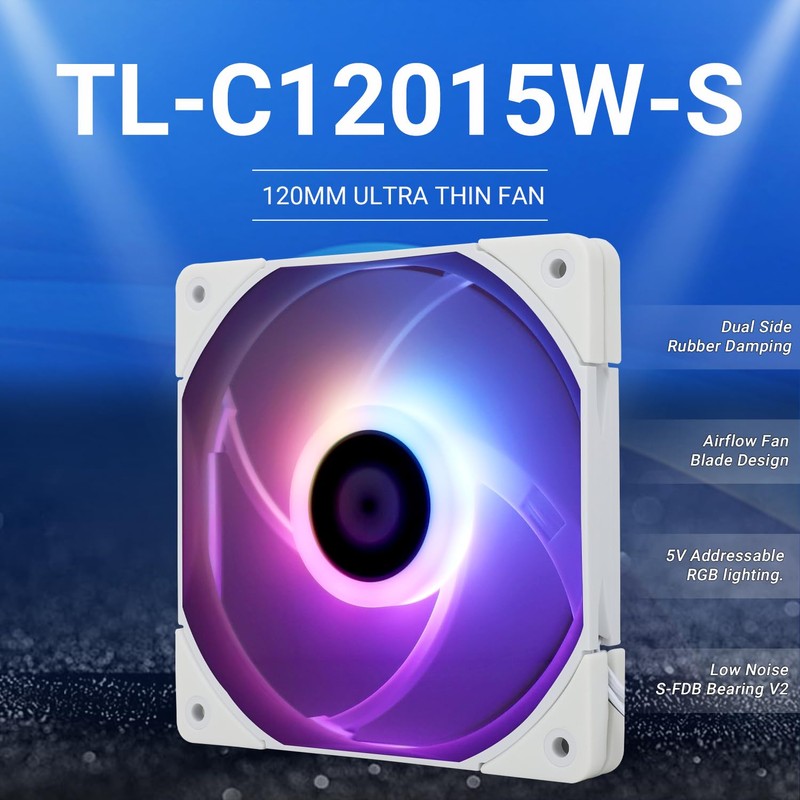 Product parameters:Size: 120*120*15mmAir volume:52CFM (MAX)Wind pressure: 1.24mm H2OSpeed: 1500RPM±10%Noise≤24.1dBAVoltage: 12VCurrent: 0.13APower interface: 4pin PWMLight wire interface: 5V 3pin ARGBPachage Contents:TL-C12015W-S case fan×1Manual/Warranty card×1Self-tapping screw×4