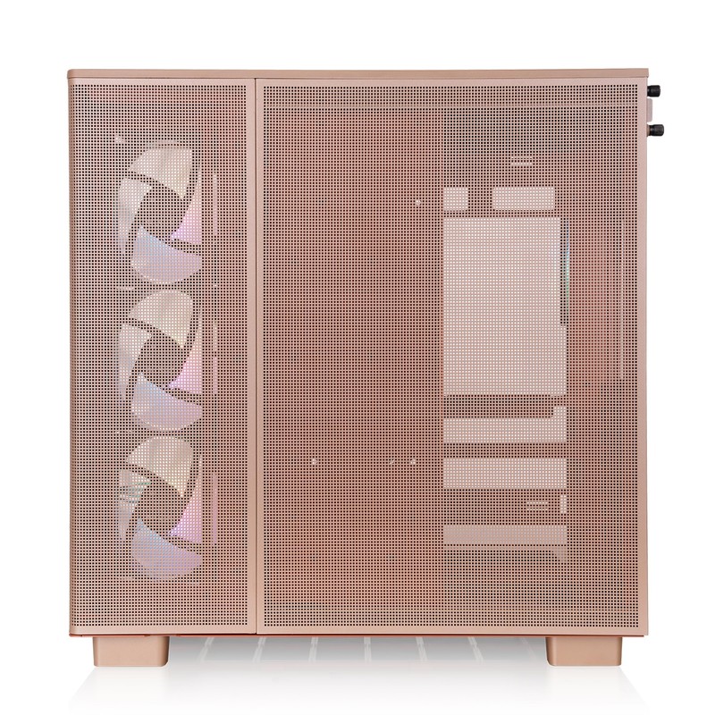 - 【Anglular Mesh】Located next to the bottom mounted I/O in the front side of the chassis we have angled out the side fan tray to better angle incoming air towards components, and to maintain the clean look of the View series we added in an angled mesh panel.