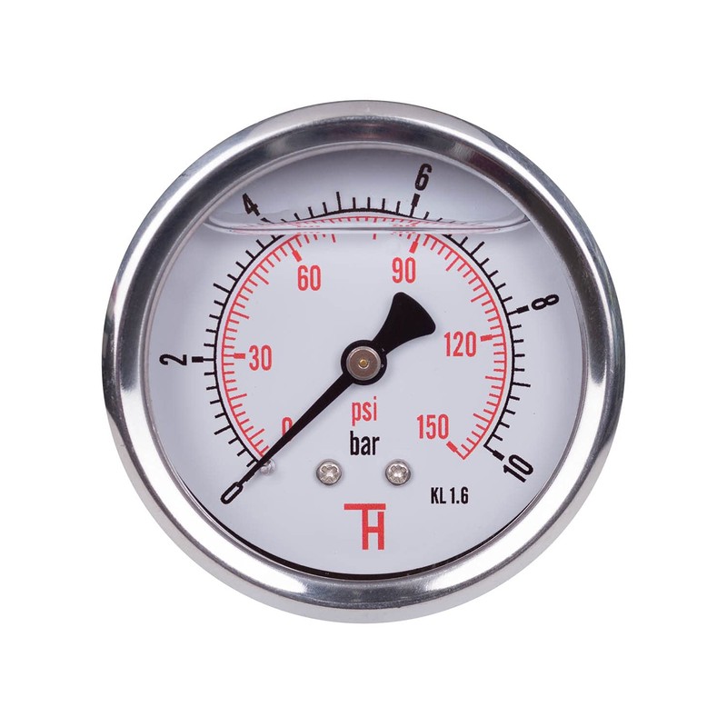 - Double scale: bar, PSI; glycerine filled; resistant pressure gauge housing;