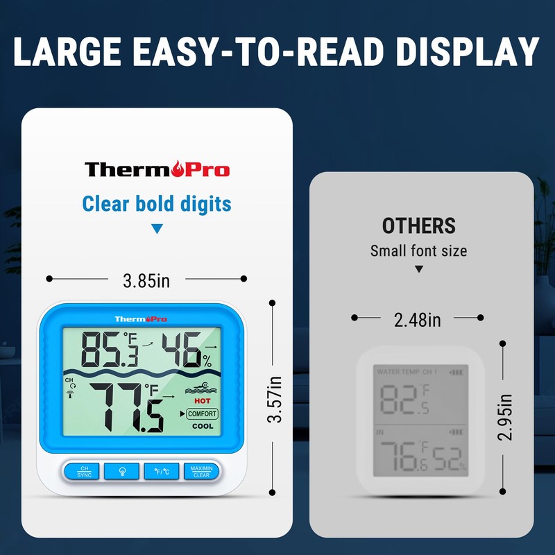 • Large Backlit Display: Pool thermometer wireless with temperature and humidity monitor features large digits and backlight to ensure easy reading even in dim light conditions; All time/24 hours max and min record helps you track temperatures throughout the day!