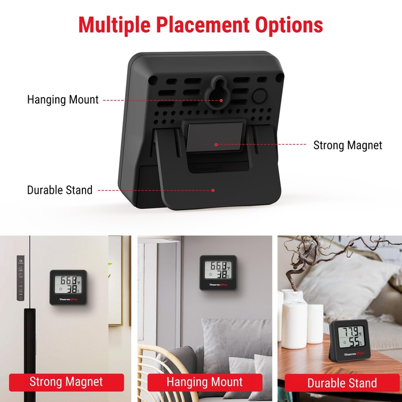 - Convenient Placement: Wall thermometer indoor is designed with tabletop stand, magnetic back and hanging hole, easily place the hydrometer digital anywhere specially small spaces such as humidor, incubator and refrigerator, etc.