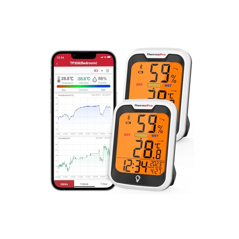 ThermoPro TP358 Bluetooth Thermometer for Room Temperature with Built-in Clock, Smart Temperature Sensor and Humidity Meter with Backlit, 260Ft Hygrometer Indoor Thermometer with Data Storage Export
