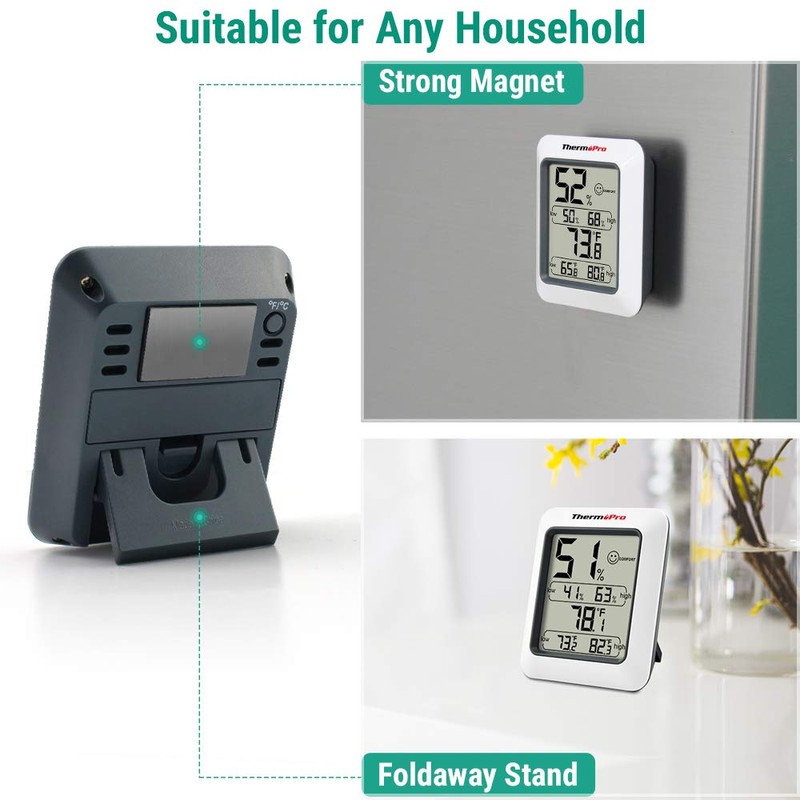 - 【Healthier Home & Environment】Thermometer hygrometer with temperature and humidity monitor ensures proper indoor humidity control has important skin, allergen and other health benefits; Can also be as refrigerator thermometer, freezer thermometer, reptile thermometer, soil thermometer, humidor hygrometer, cigar hygrometer and more