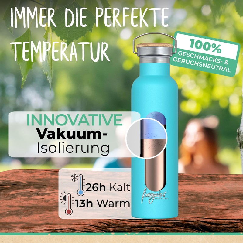 - Extra insulation – two stainless steel walls, a vacuum in between and the temperature lock copper vapour insulation ensure 25 hours cold/13 hours of warm drinks in your 1000 ml stainless steel drinking bottle. The perfect thermos bottle for tea, coffee etc.